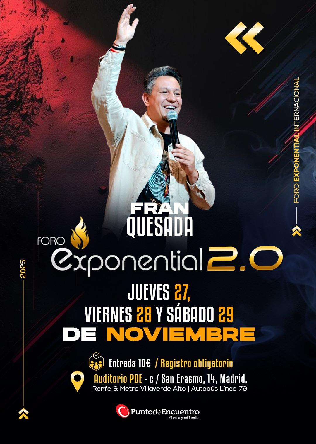 Foro Exponential 2.0 es un encuentro internacional de inspiración, formación y conexión. Tres días intensos de charlas, talleres y experiencias que te impulsarán a un nuevo nivel personal, espiritual y ministerial.